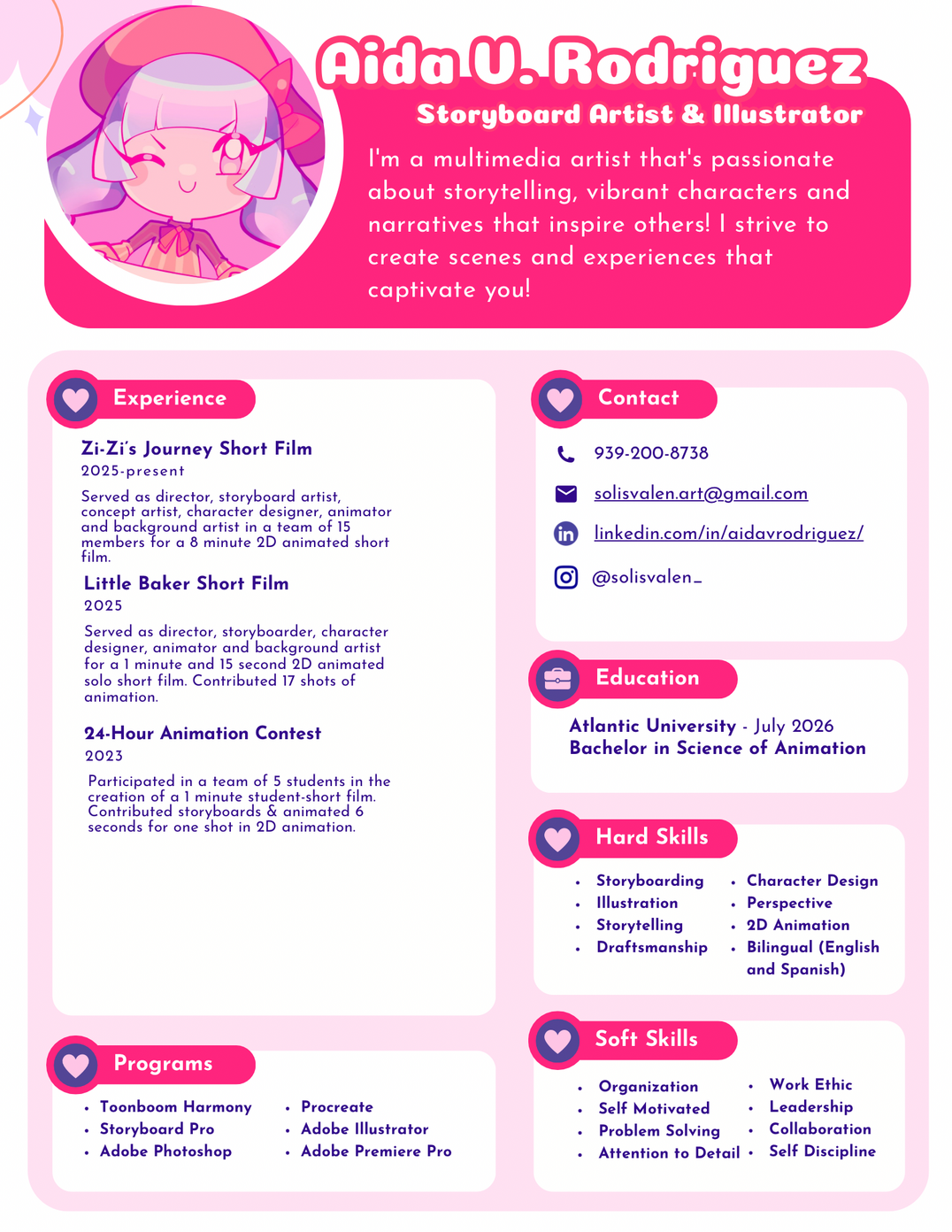 I’m Aida Rodríguez Martínez, also known by my online username as Solis Valentine. I’m a storyboard artist who specializes in storyboarding for music videos, short films and animatics. I also do 2D illustrations, character design and 2D backgrounds.